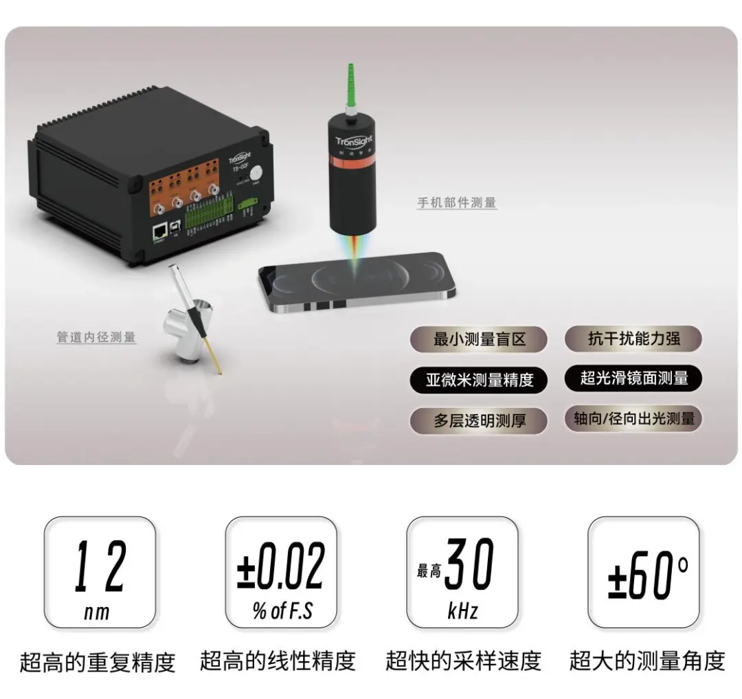 The TS-C series spectral confocal displacement sensors can achieve a repeatability of 0.012 µm, a linear accuracy of ±0.02% of F.S., a measurement speed of 10kHz, and a measurement angle of ±65 degrees. They are capable of adapting to various material surfaces such as mirror, transparent, semi-transparent, film layers, metal rough surfaces, and multi-layer glass. They can also measure the inner and outer diameters of pipes and deep holes. They support data transmission interfaces including RS485, USB, Ethernet, and analog signals.