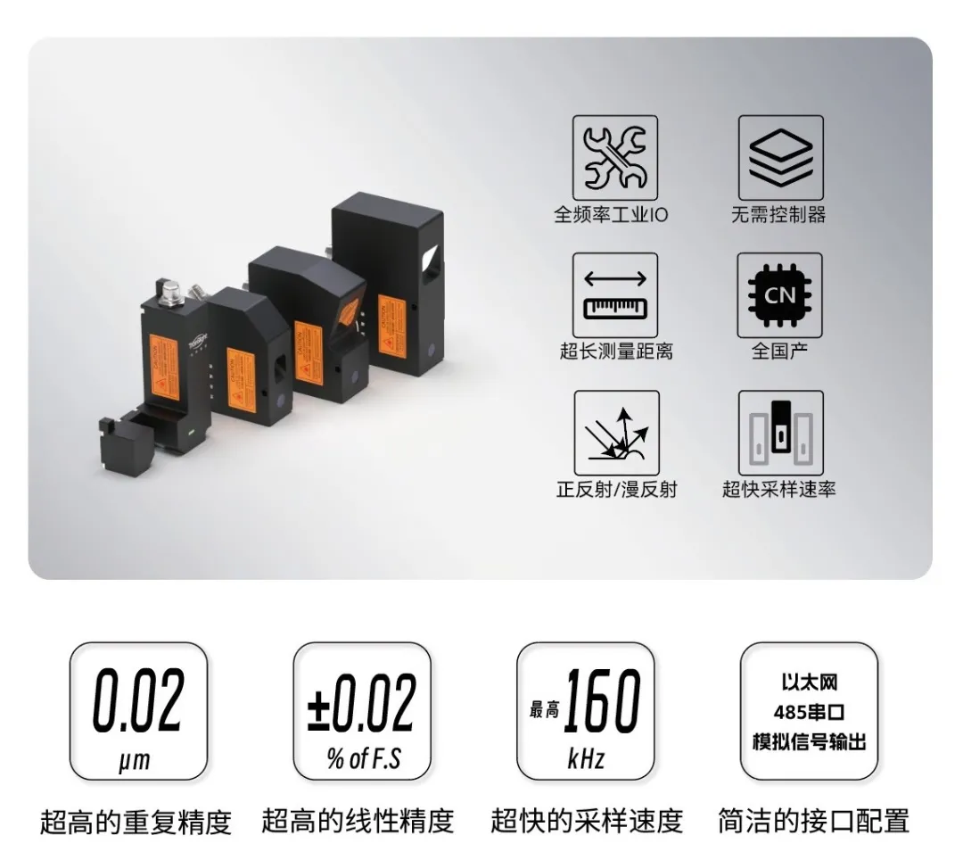 The TS-P series laser triangulation displacement sensors can achieve a repeatability of 0.02 µm, a linearity accuracy of ±0.02% of F.S., and a measurement speed of 160kHz. They support data transmission interfaces including RS-485, analog, external level trigger, USB, and Ethernet, with the first three being directly accessible from the probe. The product is widely used in industries such as 3C electronics, semiconductor photovoltaics, new energy, automotive manufacturing, and municipal inspections.