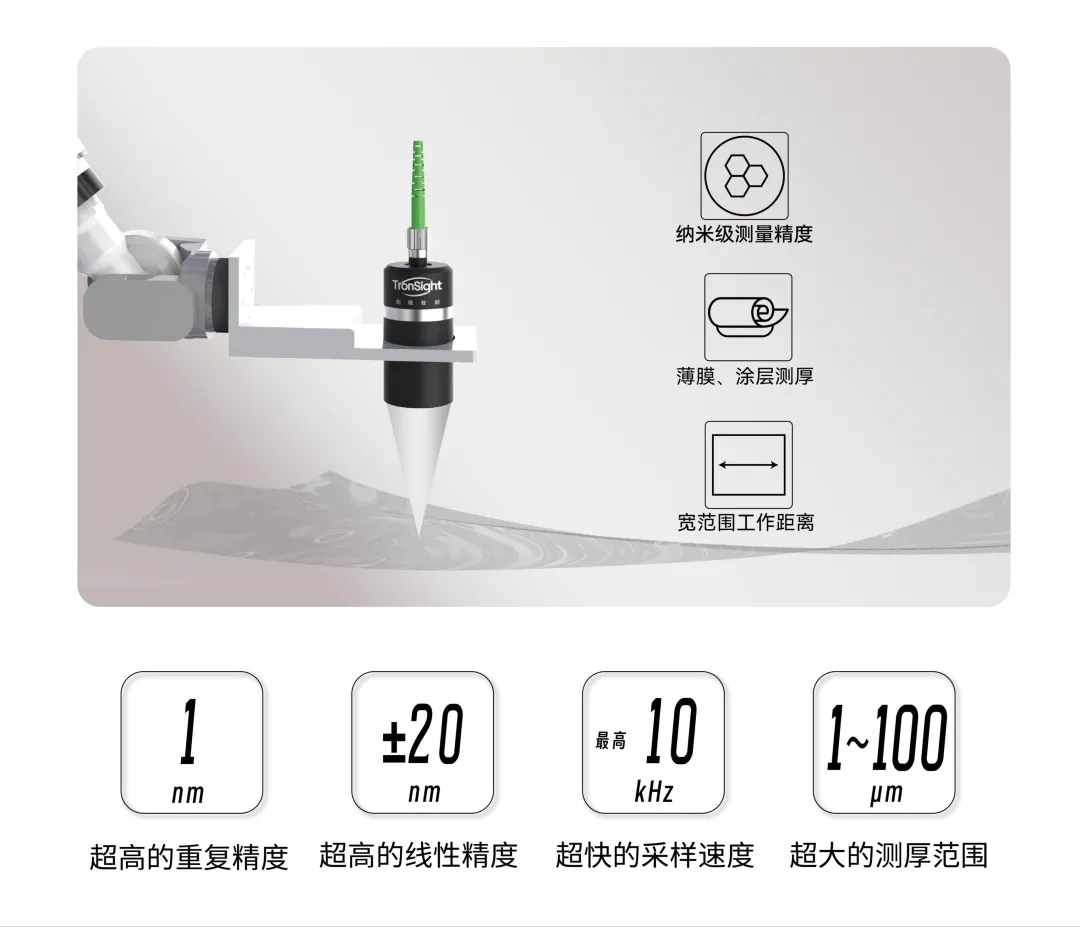 The TS-IT series white light interference thickness sensor can achieve a repeatability of 1nm, a reference distance of 50mm, a measurement range of ±2mm, and a linear error of <±20nm. It can be used to measure the thickness of thin materials such as coatings, thin films, and glass. It supports data transmission interfaces including RS485, USB, Ethernet, and analog signals.