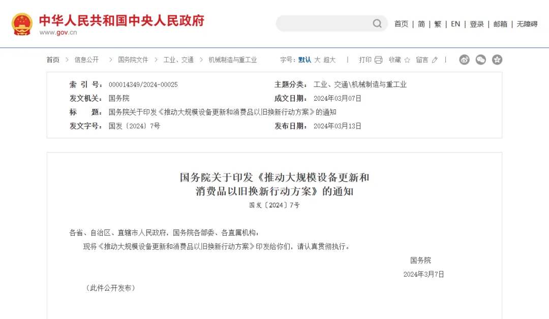 Recently, the State Council issued the "Action Plan for Promoting Large-Scale Equipment Renewal and Consumer Goods Replacement," which proposes that digital transformation and intelligent upgrading are important directions. It strongly promotes the renewal of equipment and technological transformation in key industries such as teaching and research technology equipment, new energy equipment, urban infrastructure, and production equipment. Implementing large-scale equipment renewal and consumer goods replacement will effectively boost investment and consumption, benefiting both the present and the future.