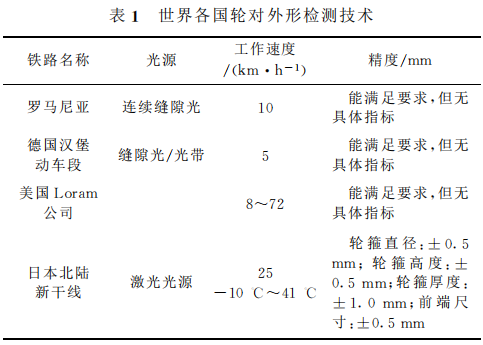 For automatic measurement of wheelset geometric parameters, devices developed by rail transportation advanced countries mainly use ultrasonic technology or charge-coupled device (CCD) technology. Russia adopted ultrasonic measurement methods around 1995, successfully developing an automated detection device that can run at no faster than 5 km/h. Sensors were installed to measure each characteristic surface of the wheel, after processing, the measured values had a wheel diameter error not exceeding 1 mm, an edge thickness error not exceeding 0.5 mm, and a tread wear error not exceeding 0.30 mm. Other countries all adopt CCD technology for automatic testing of wheelset external dimensions, summarized as Table 1.