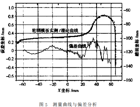 Measured results are shown in Figure 4: Point-line curves show real-time measurement results of the template model, dashed curves denote standard wear type tread profiles, solid curves represent measurement deviation curves & From figure, maximum measurement error appears near the inner side of the rim, with maximum deviation ±0.3mm, tread measurement deviation is within ±0.1mm.