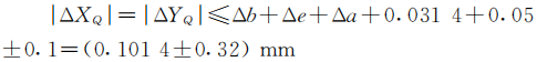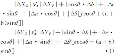 This scheme’s measurement error originates from measurement apparatus, sensors, and digitalization errors etc., according to Equation (2), coordinate value of point Q on the tested surface is affected by coordinate point P, rotation angle θ of the sensor, sensor characteristics, a and e calibration deviations. They are denoted as ΔXP, ΔYP, Δθ, Δa, Δb, and Δe, respectively. Maximum error estimation formula of coordinate value of point Q is given below: