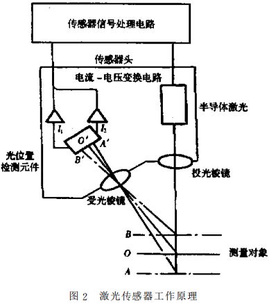 Laser displacement sensor working principle is shown in Figure 2. Light beams emitted from semiconductor laser sources are focused into points by concave prisms, reflected off the object under test, part of which reflects back to the receiving prism where they focus again on position detecting elements. As the object moves from O point to A or B, the position detecting element will move correspondingly from O' point to A' or B'. By calculating the position of the detected light spot on the position detecting element, the displacement amount of the tested object can be obtained. Since the optical system uses high-precision non-spherical prisms, and the circuit has a function of linearization, therefore, output voltage proportional to distance can be achieved, providing highly reliable detection systems.