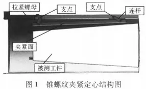 1.2 Clamping Centering Part The clamping centering part mainly consists of a tightening mechanism, tension nut, bushing, and clamping surface. Three clamping surfaces are evenly distributed on the bushing, playing a centering role in clamping the tapered thread. When the tension nut pulls the connecting rod, with the support of the fulcrum, the clamping surface can swing at a certain angle. When the swinging angle is the same as the taper of the tapered thread, the workpiece to be measured is clamped. The structure is shown in Figure 1.