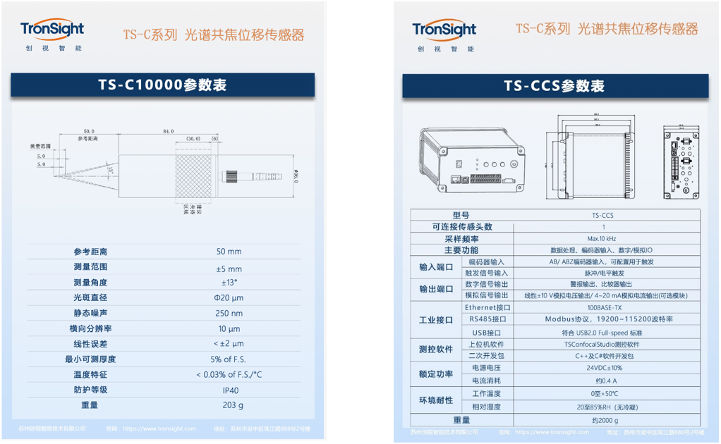 The measuring scene uses the TS-C10000 spectral confocal sensing head from Cview Intelligent Technology Co., Ltd. and CCS controller. The TS-C series spectral confocal displacement sensors can achieve a repeatable accuracy of 0.025 µm, ±0.02% of F.S. linearity accuracy, sampling speeds up to 10 kHz, and an angular range of ±65°, making it suitable for surfaces made of mirrors, transparent materials, semi-transparent materials, coatings, rough metal surfaces, multi-layer glass, etc. It supports data transmission interfaces including RS-485, USB, Ethernet, and analog quantities.